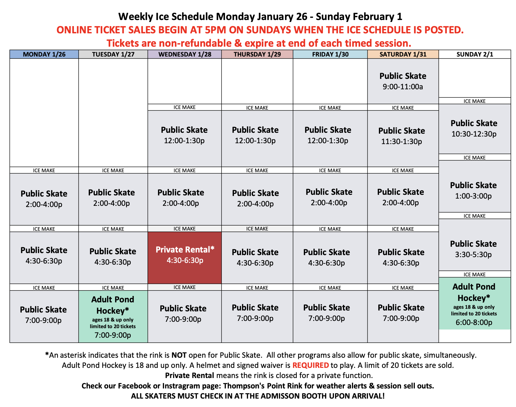 closures or cancellations, please visit the Thompson’s Point Rink Instagram page.